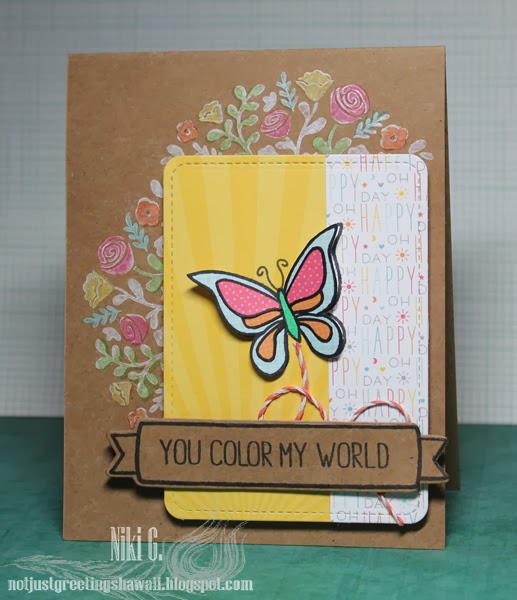 Fun right?! I paper pieced the butterfly and used the Lawn Trimmings as the trail of the butterfly. The Penelope's Blossoms were inked in Unicorn pigment ink and then double stamped with the matching individual flowers in colored inks. I'm IN LOVE with the Penelope's Blossom set and there are matching dies to make all kinds of patterns or bouquets! I'll be entering this in the Simon Says Stamp Wednesday Challenge as well.